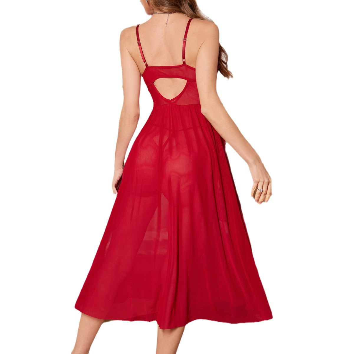 Nouvelle nuisette longue fendue en résille rouge sexy
